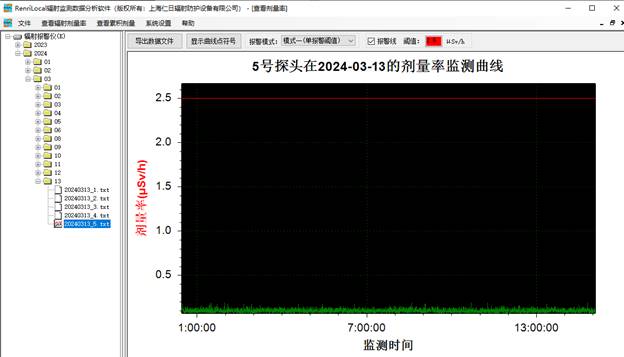 6、数据分析:免费提供功能强大的RenLocal辐射监测数据分析软件,可通过曲线和棒状图的形式分析历史剂量率和累积剂量数据以及实时查询报警数据与统计分析等